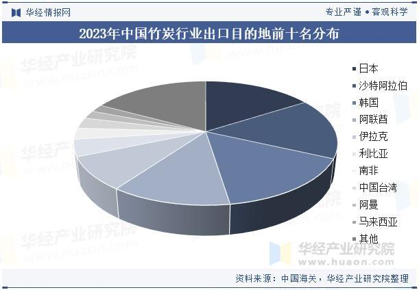 从中国竹炭行业出口目的地分布来看,主要出口亚洲地区,其中日本占比最重,2023年出口量为9040吨,占比15.95%,其次为沙特阿拉伯,出口量为9026.07吨,占比15.92%,第三名为韩国,出口量为8888.61吨,占比15.68%。