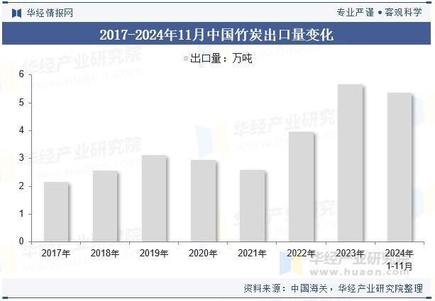 中国是竹炭生产大国,而且中国为竹炭行业主要的出口国,出口量远大于进口量,数据显示,中国竹炭行业出口量总体呈现上涨态势,尤其是近两年,中国竹炭行业出口量快速上涨,2023年中国竹炭行业出口量为5.66万吨,2024年1-11月中国竹炭行业出口量为5.36万吨。