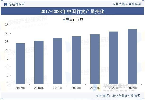 随着中国竹林产量上涨,带动中国竹炭行业产量稳步增长,数据显示,中国竹炭行业产量从2017年的24.15万吨上涨至2023年的32.52万吨。随着中国竹炭行业产业链下游应用领域的发展,未来中国竹炭行业需求量将继续呈现上涨态势,带动行业产量持续上涨。